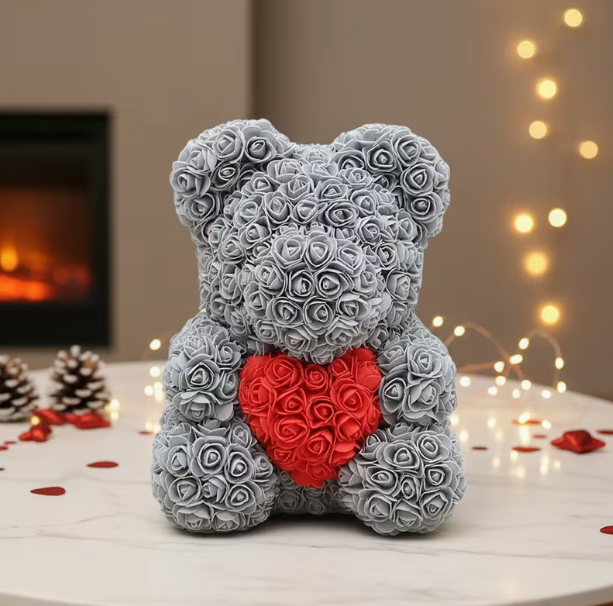 Sivi medvjedić od ruža s crvenim srcem RGYROSE