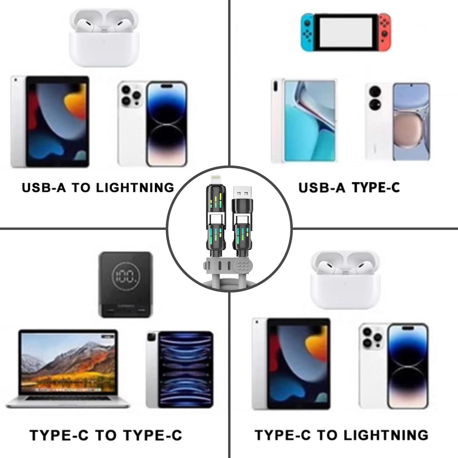 S ovim 4-u-1 kablom imaš sve što ti je potrebno za brzo punjenje i prijenos podataka. Spaja 4 različita ulaza u jednom kabelu, što znači da možeš jednostavno puniti sve svoje uređaje. Kompatibilan je s uređajima iPhone, Android i svim uređajima s priključkom C.