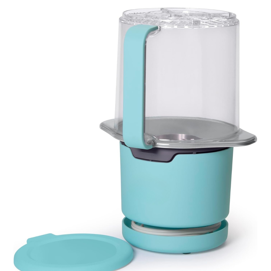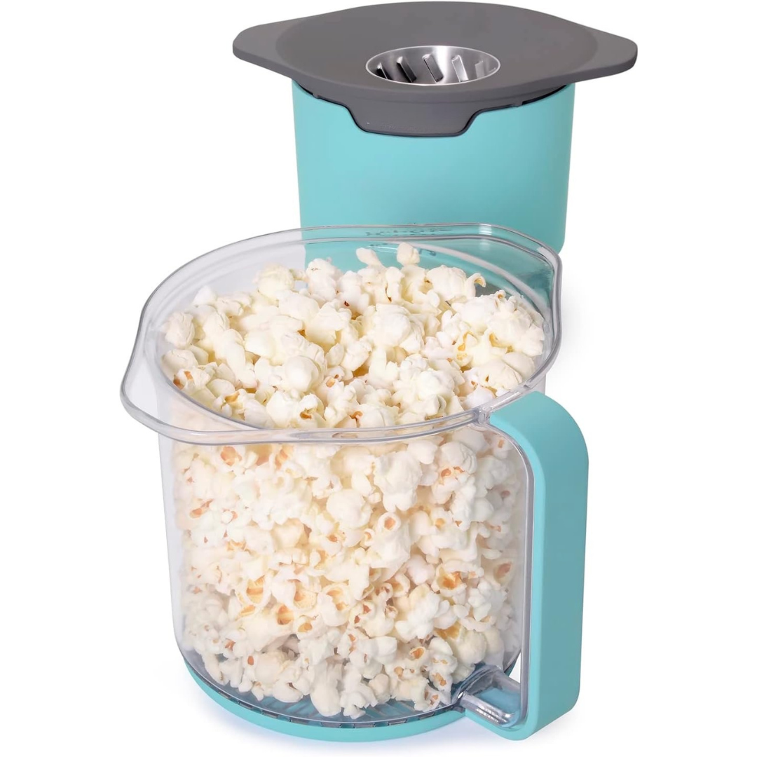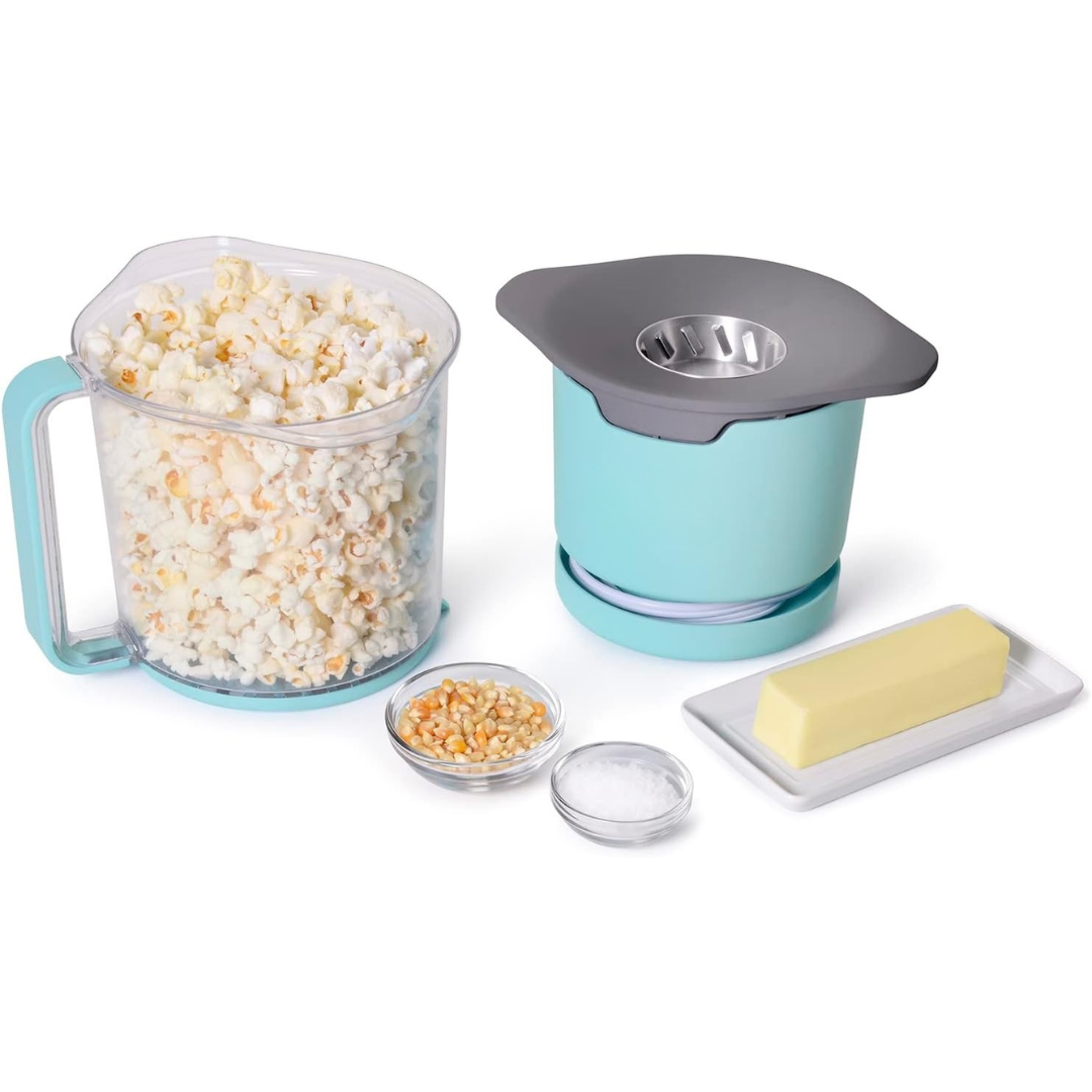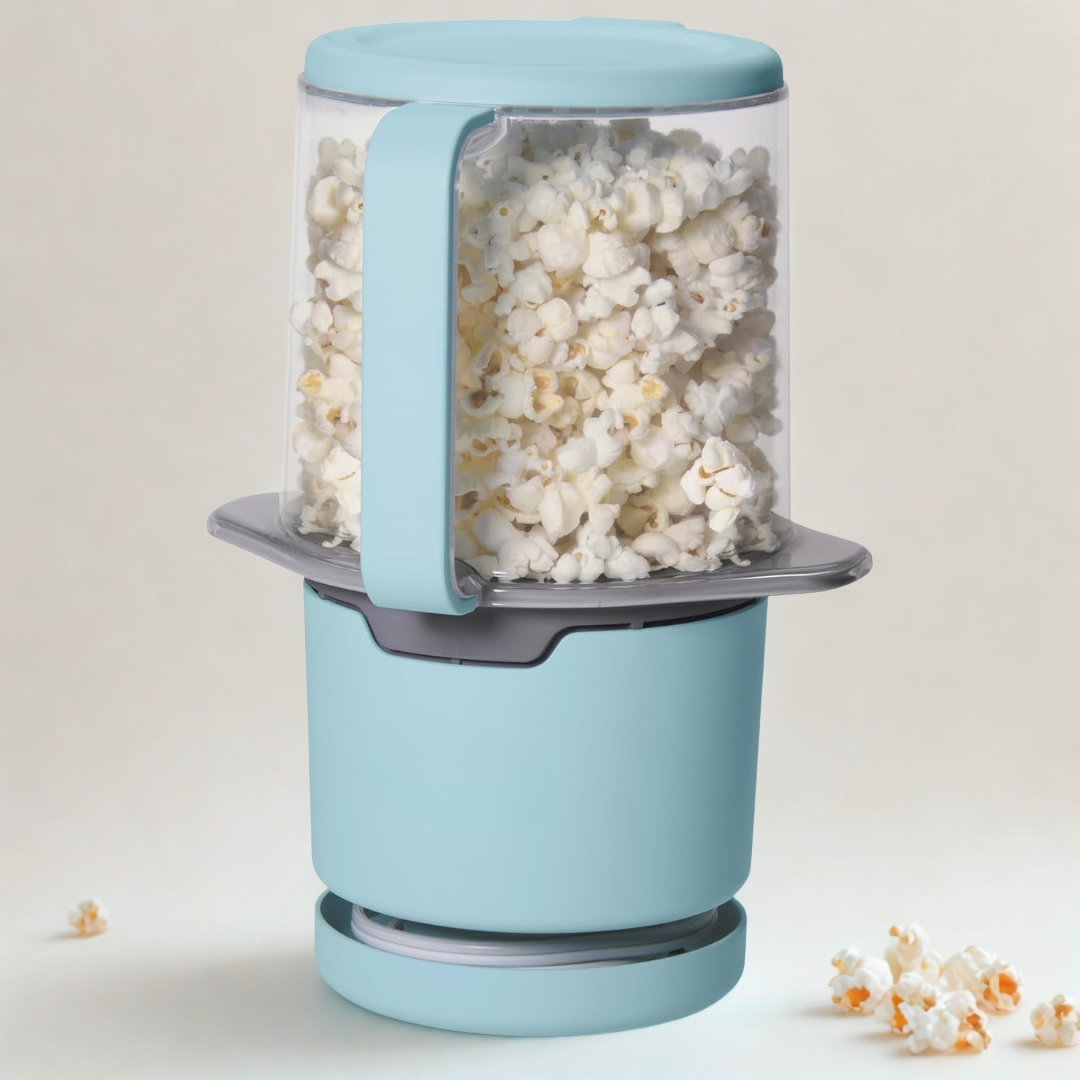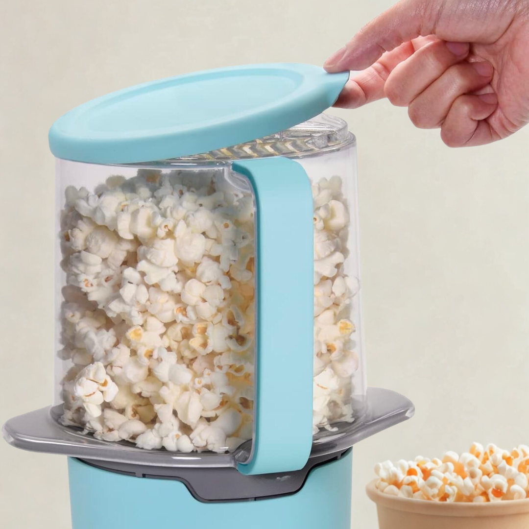 Ugrađeni držač za kabel u bazi omogućuje uredno i kompaktno spremanje. Ventilirani poklopac održava kokice hrskavima tijekom pripreme, a poklopac se može sigurno zatvoriti preko otvora kada se koristi kao posuda za posluživanje. Kompatibilan je i s običnim i s gourmet kokicama za izvrsne rezultate.