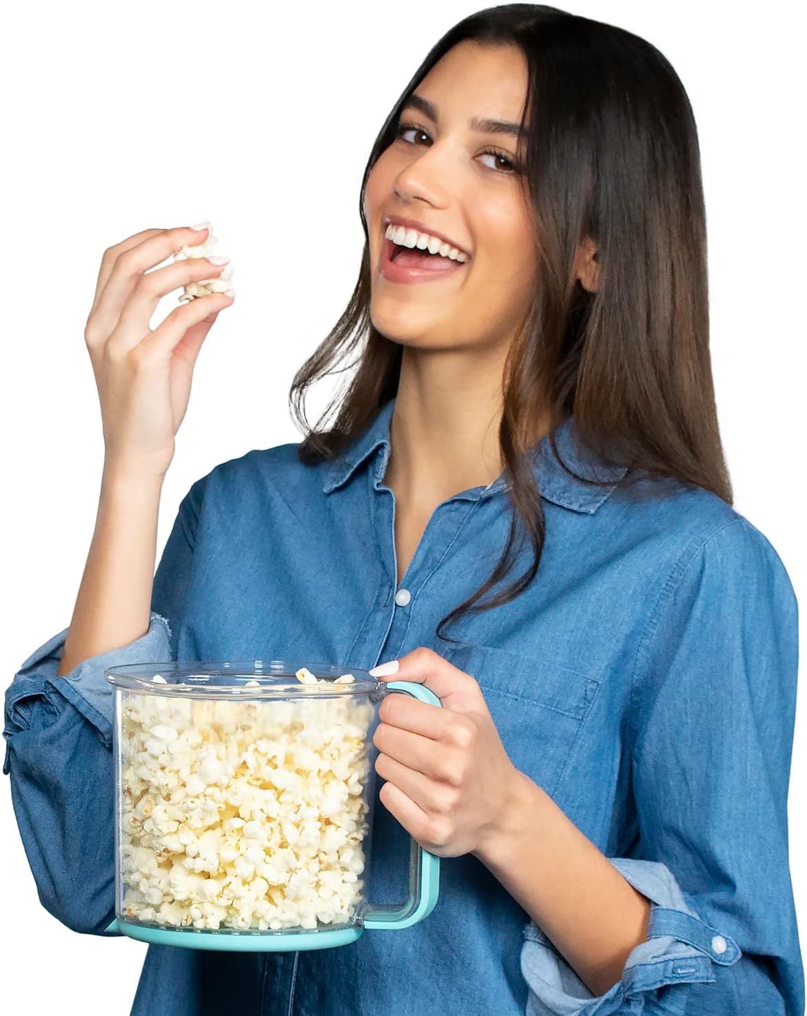 Prozirni poklopac ujedno je i praktična posuda za posluživanje s ugrađenom ručkom za nošenje, savršena za dijeljenje kokica bilo gdje. Bez uporabe ulja, i baza i poklopac se lako prebrišu, pa je čišćenje nakon uživanja u kokicama jednostavno.