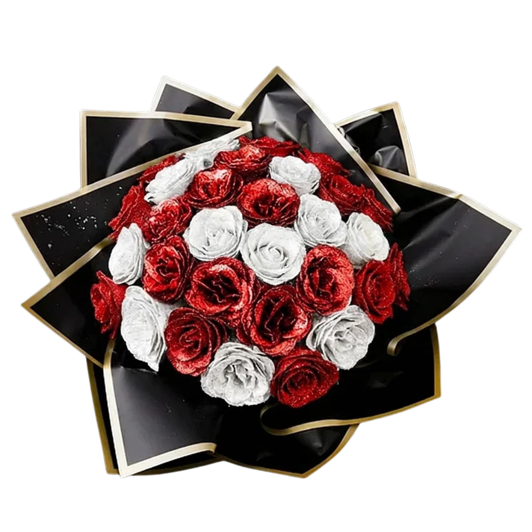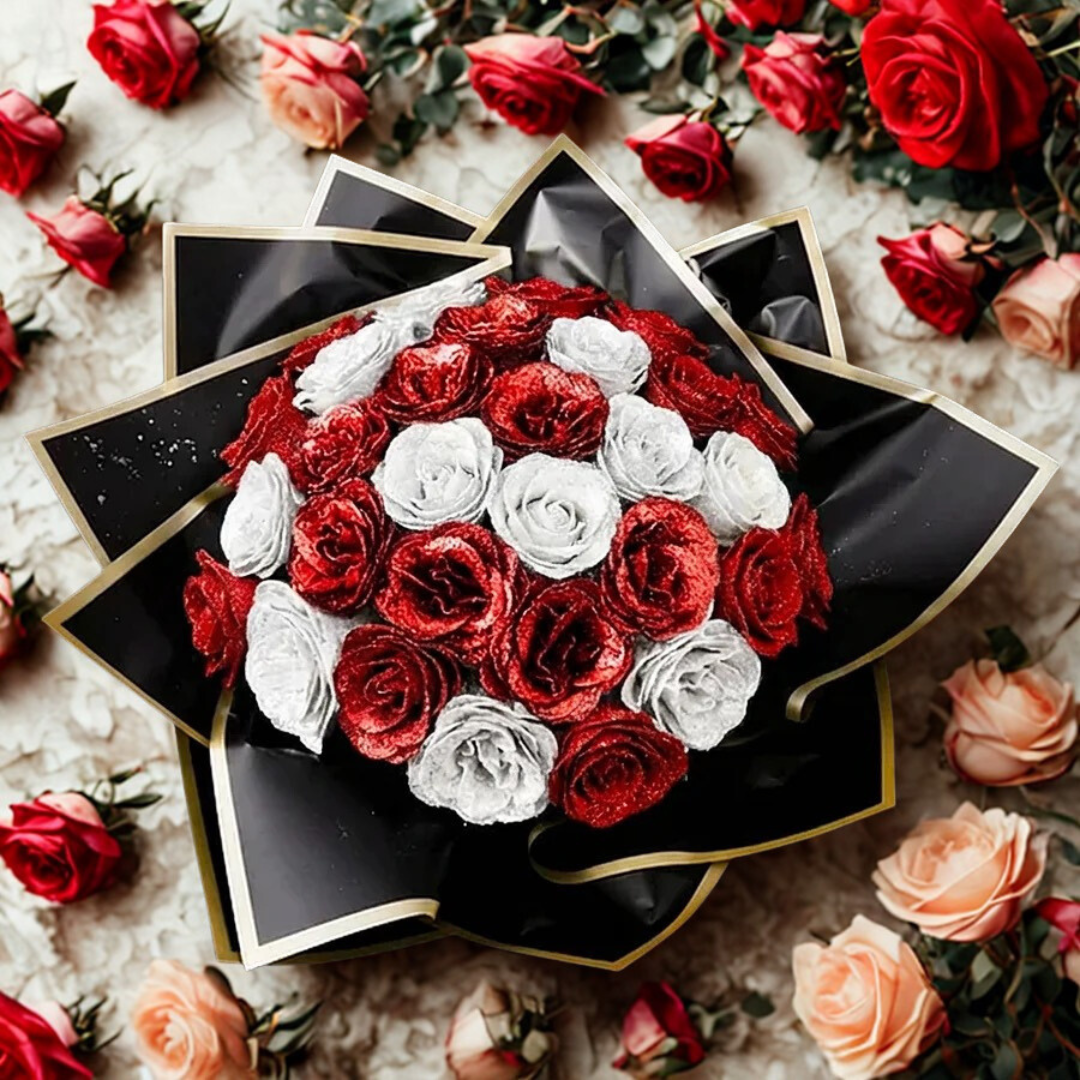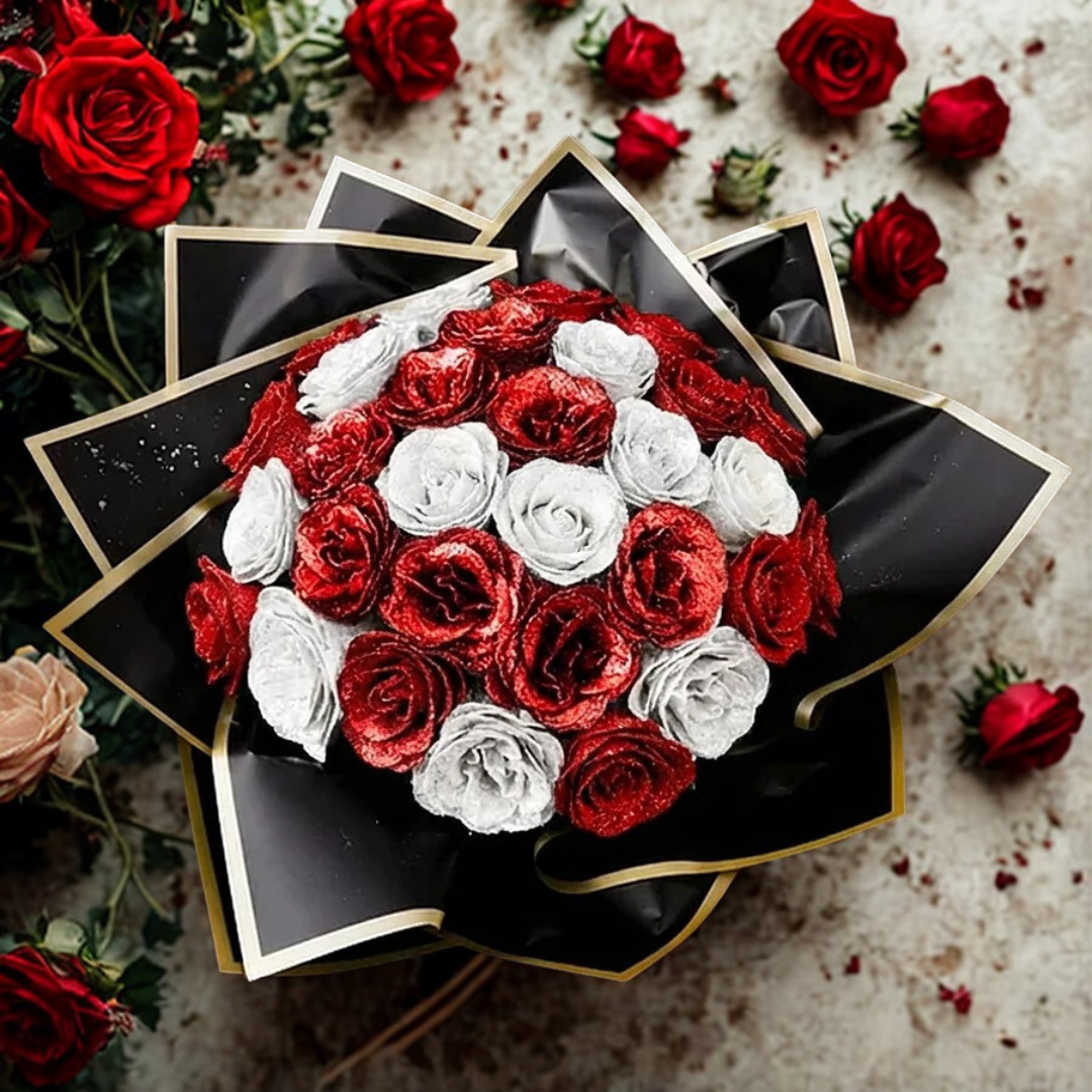 Kombinacija crvenih i bijelih ruža u ovom buketu simbolizira ljubav, strast i čistoću. Idealan je poklon za izražavanje dubokih emocija i stvaranje nezaboravnih trenutaka s vašim voljenima, bilo kao romantična gesta ili iskreno, toplo iznenađenje.