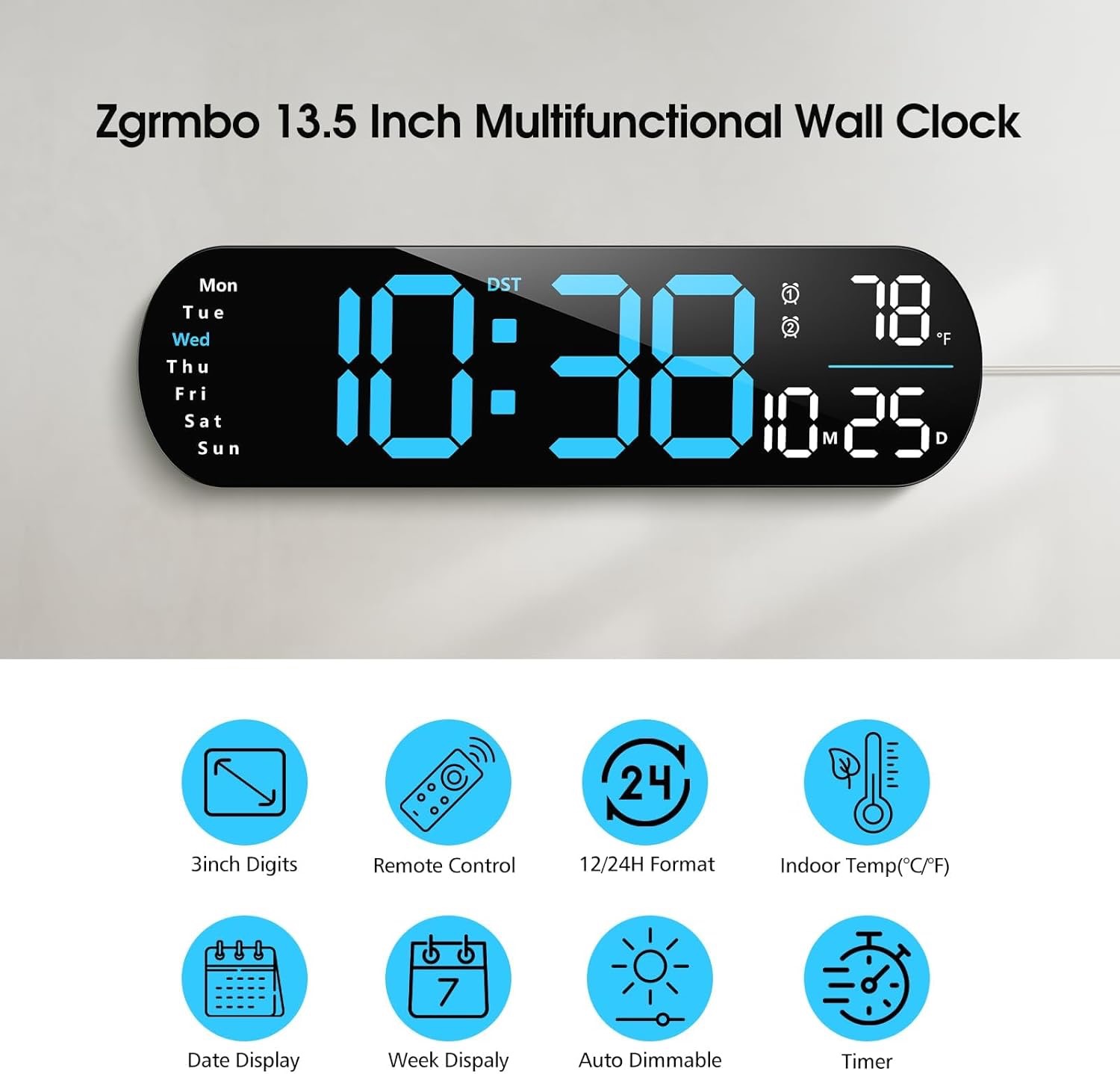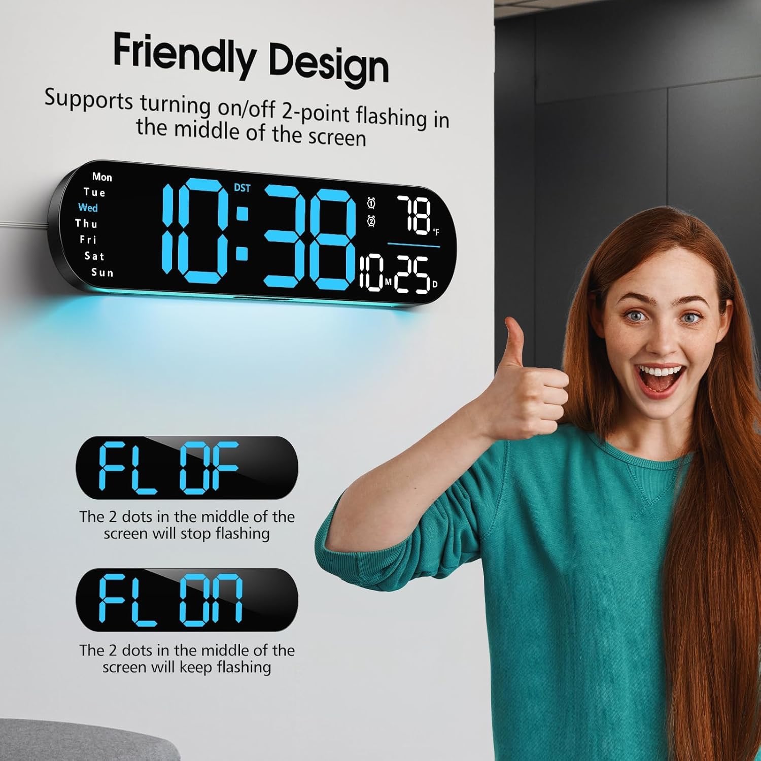 Sat se može montirati na zid ili postaviti na stol, ovisno o vašim željama. Možete uključiti ili isključiti treptajuće točkice za prikaz bez ometanja, što ga čini idealnim za urede, radne ili spavaće sobe.
