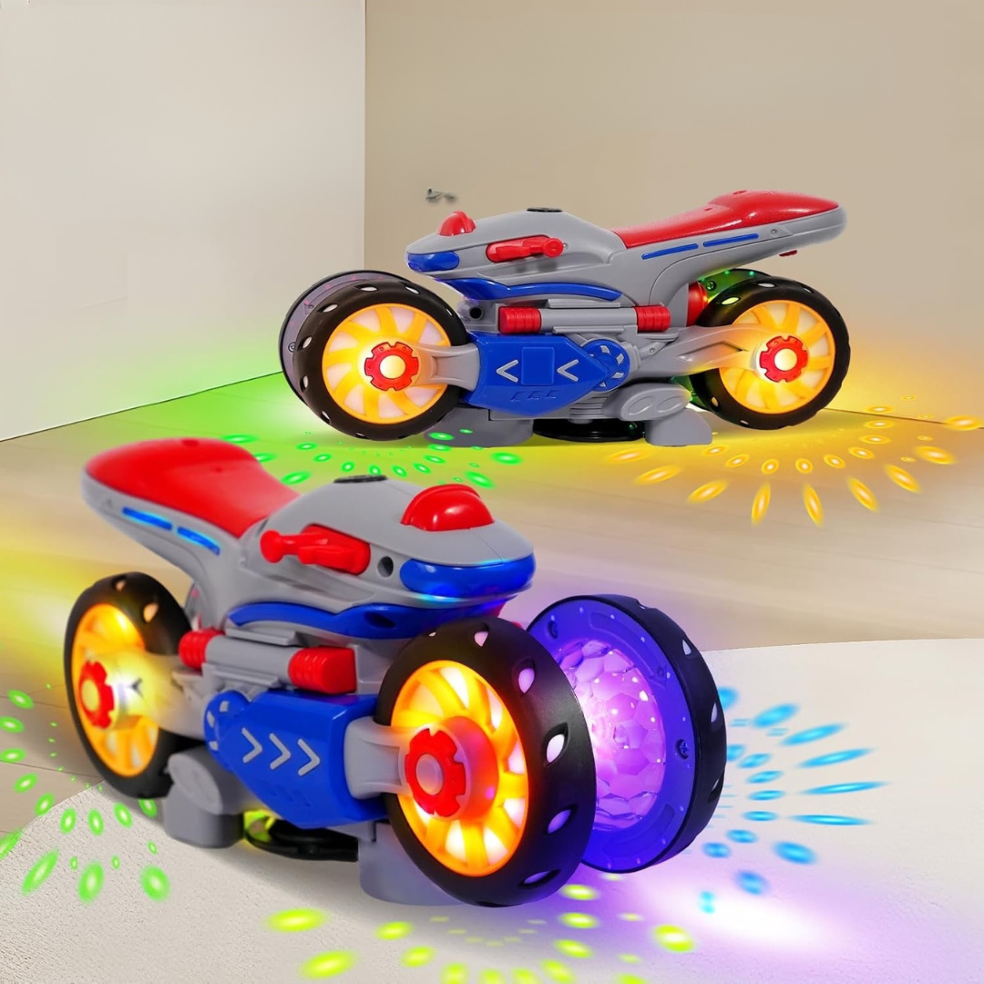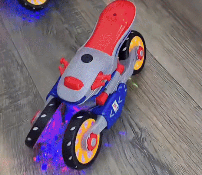 Ovaj motocikl za stunt vožnju neprekidno zabavlja — kad udari u zid, automatski mijenja smjer, svijetli i svira veselu glazbu. S funkcijom automatske transformacije pruža neprestano uzbuđenje i zabavu za Vaše dijete.