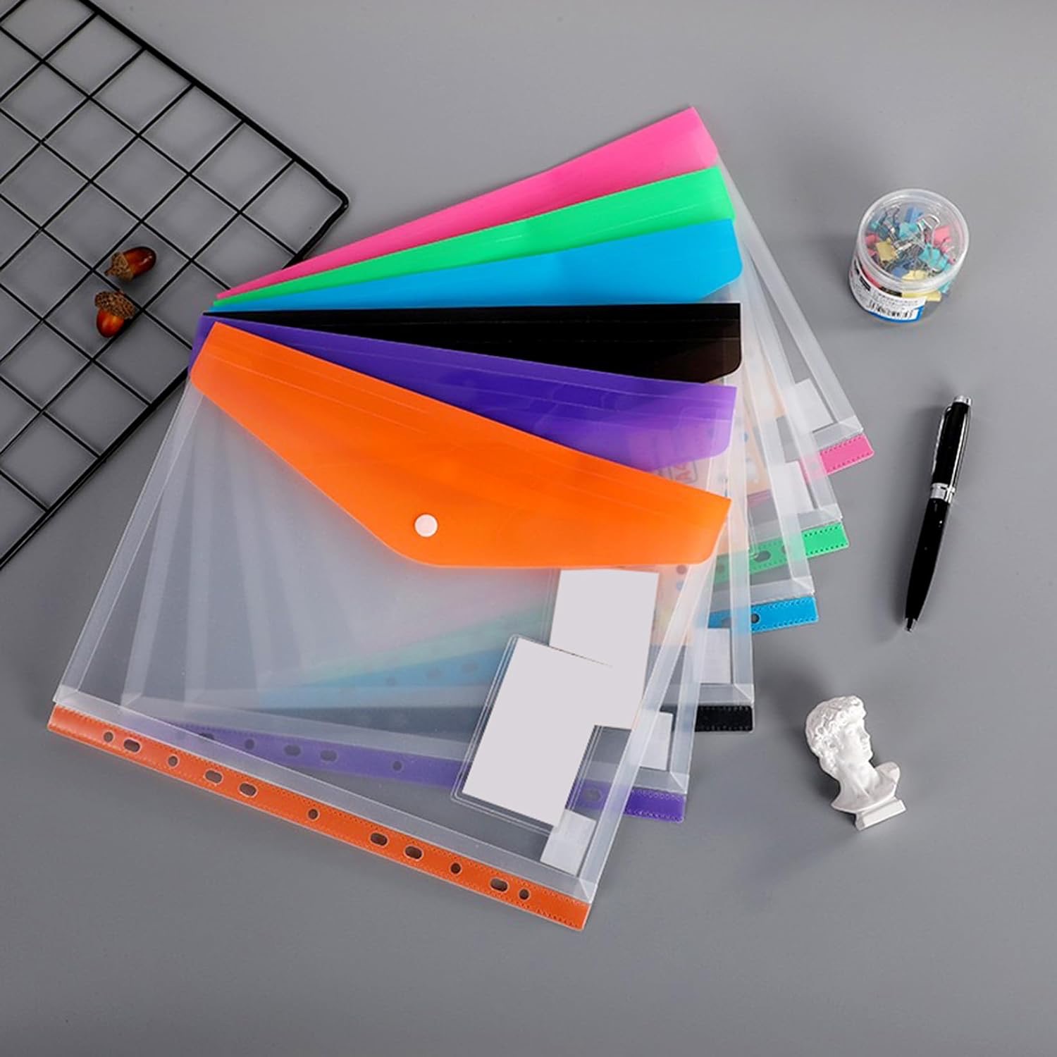 Zahvaljujući prozirnom materijalu, odmah vidite što se nalazi unutar mape bez otvaranja. To znači manje traženja i više produktivnosti! Kopča na gumb čuva vaše dokumente sigurnima.