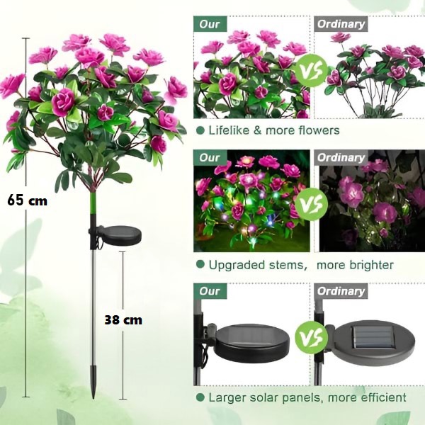 Ove solarne lampe dizajnirane su kao realistični cvjetovi azaleje koji naglašavaju prirodnu ljepotu vašeg vrta, dvorišta ili staze. Tijekom dana se savršeno stapaju s krajolikom, a noću nježno svijetle, stvarajući šarmantnu i gostoljubivu atmosferu ☀️