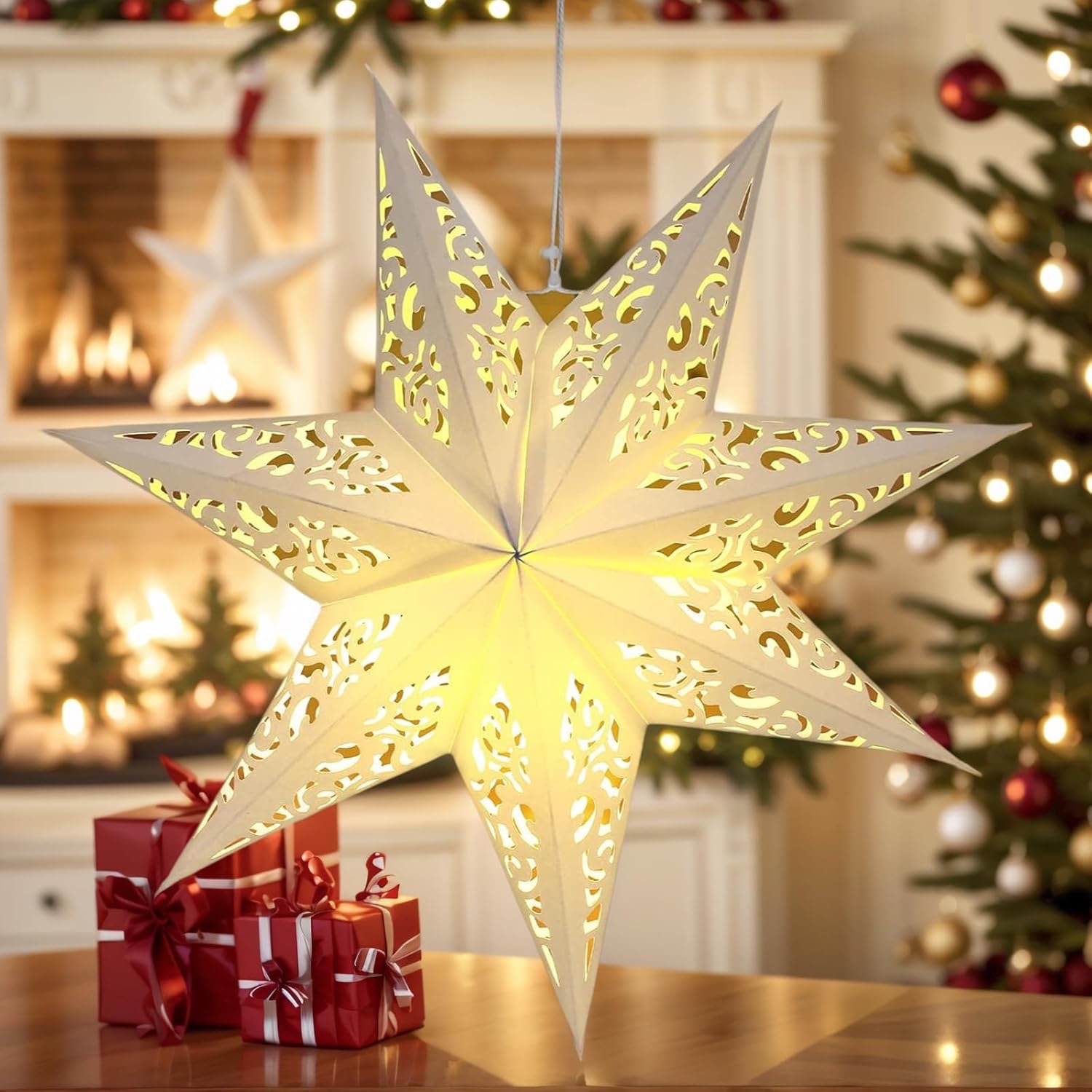 Izrađene od visokokvalitetnog papira, ove sjenila u obliku zvijezde ručno su rađene s posebnom pažnjom i preciznošću. Nježno integrirano osvjetljenje stvara ugodnu i toplu atmosferu, idealnu za Božić, vjenčanja, baby shower-e ili proslave. Svaka zvijezda zrači ljepotom i profinjenošću, što je čini savršenim središnjim ukrasom za moderne i tradicionalne interijere.